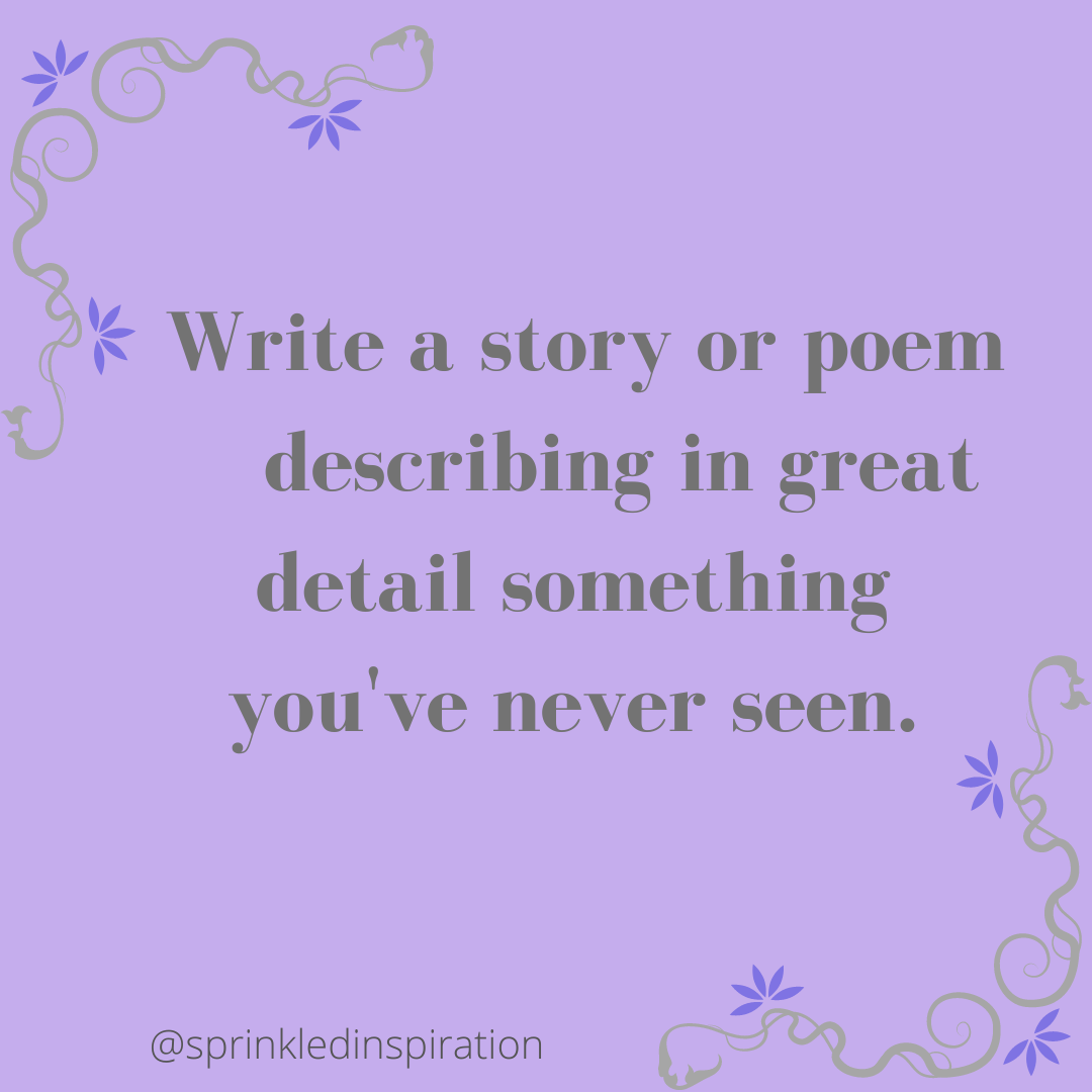 Daily prompt for July 9, 2022Heather L HuffmanJul 09, 20221Share*Photo caption: Write a story or poem describing in great detail something you’ve never seen.Thanks for reading Sprinkled Inspiration Newsletter! Subscribe for free to receive new posts and support my work.SubscribePreviousNext